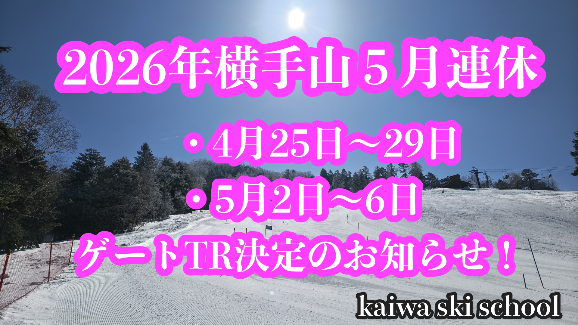 ・・・<GWキャンプゲートTR決定>・・・本日、横手山スキー場よりGWゲートTRに関するご連絡を頂きましたのでご報告致します。雪解けが異常な早さで進むなか、スキー場スタッフの努力により何とかゲートTR出来るよう努めるとの連絡でした。今年は小雪の影響もあり多くのチームよりゲートTR希望が入り、少しでも多くのチームにゲレンデ提供をしたいと言う事もあり合同TRは勿論、早朝組と午前組に分けて第4ゲレンデを