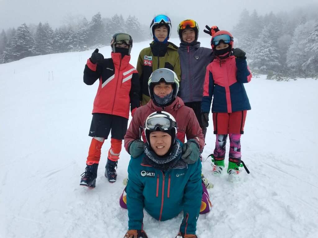 皆様お疲れ様です。昨日の陽気は何だったんでしょうか?それが一転、今日の横手は曇り時々雪+ガス。とにかく寒くありました。横手山洗礼シリーズVol.3と言ったところでしょうか。スキースポーツ、寒いところでやるのが当たり前で悪いことばかりではありません。昨日緩んだ雪が冷気で締まってカッチカチやで。ゴーヤンクリジャイ氏が表現したように将に「天然インジェクション」。お陰で良い練習が出来ました。参加選手も前半は8名で高効率のトレーニングになりました。練習後に撮った写真には6名しか居ません。理由は小学生の女子が余りの寒さのため、リタイアしてしまったことに因ります。それほど寒かったと言うことで、「勘弁してやっておくんなせぇ」。