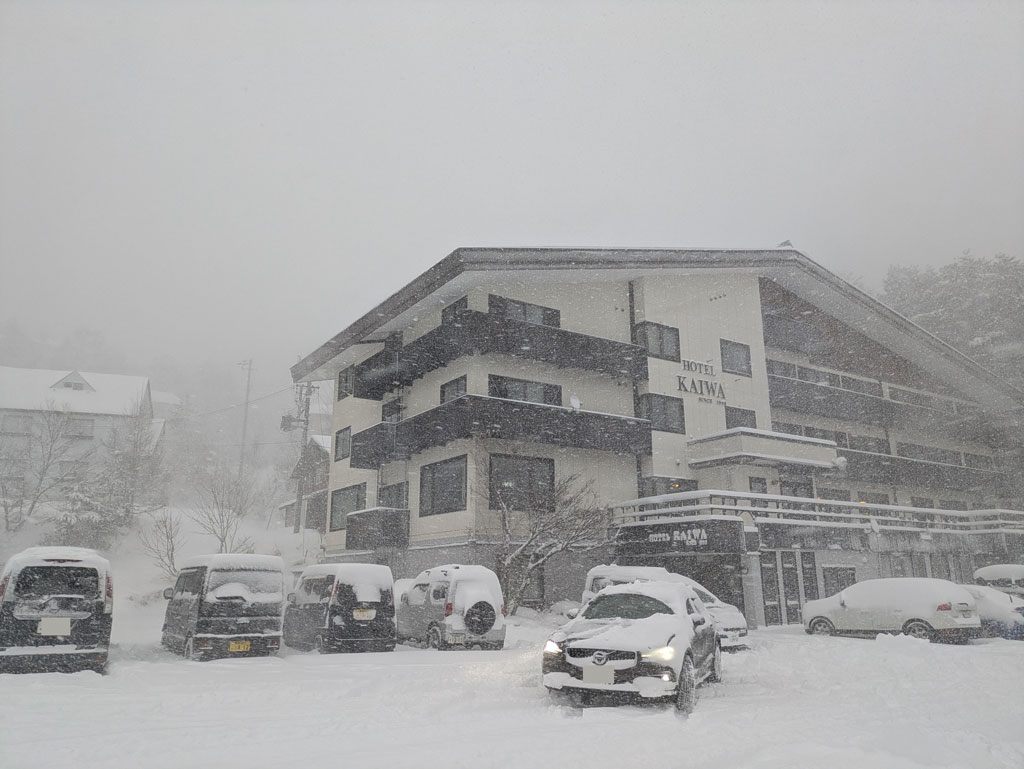 トレーニングが終わり遅めの昼食を食べて積雪量は「ホテルカイワ」前で40~50cm