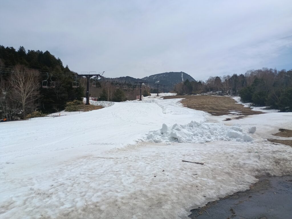 第1リフト乗り場近くから。第1ゲレンデ下部のコースが二手に分かれるところ。道路側は雪出しのため閉鎖。マジ雪解けは早過ぎます。