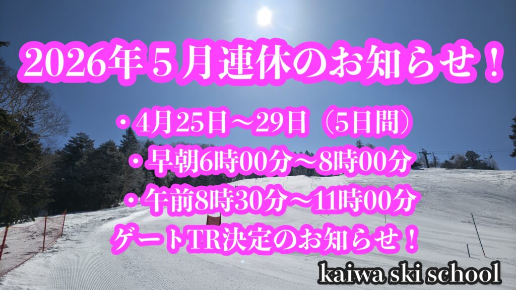 本日、スキー場より25日〜29日までは上記通り、早朝TR後、引き続き後半のゲートTRが可能になりましたのでご案内申し上げます。